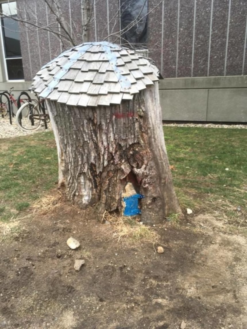 この画像を大きなサイズで見るでも、こうした木はずいぶん前に切り倒されて、その切り株は鮮やかな色の椅子や、新入生が日光浴する腰掛になっていた。プーさんの家だけが残っていたが、ハーバードサイエンスセンターの外壁のセメントをはがす2012年の改修工事のときに、その木も切り倒された。