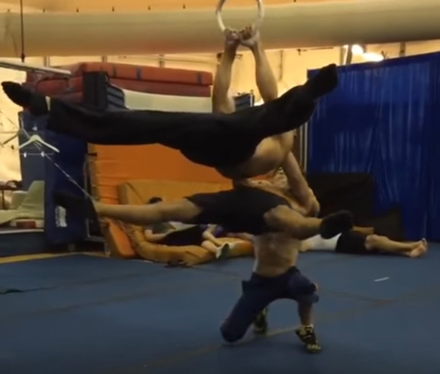 誰が凄いってみんなすごいけど、やっぱ吊り輪を持ってる一番上の人?吊り輪を持った男性の肩に手をかけそこにぶら下がった男性の肩にまた男性がぶら下がるとかいう、マッチョな男性3人による謎の競演だ。でもありがたく筋肉を鑑賞することにするよ。