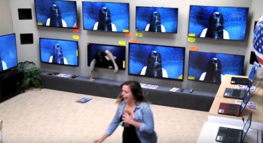 そのプロモーションとしてこんなどっきりが仕掛けられた。ディスカウントをうたった家電ショップを作り上げ、お客さんを呼び込む。たくさん並んだテレビモニターの中から貞子(サマラ)がぺこり~んと顔を出すのじゃ。