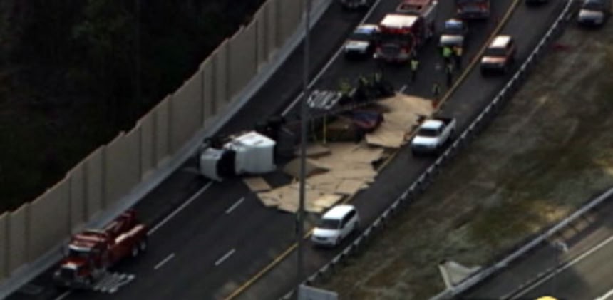 大型トラックの荷物のおかげで後ろの乗用車は(多分)巻き込まれずに済んだのかな