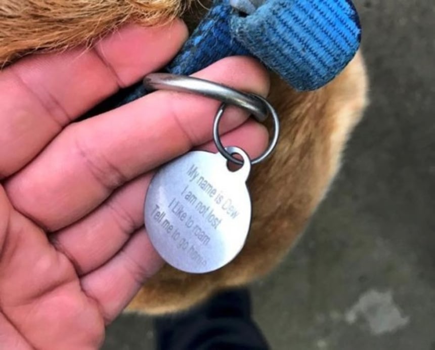 だが町をうろちょろしている犬を見かけたら、何事かと思うだろう。タイラー・ウィルソンは、自宅近くでさまようゴールデンレトリバーとラブラドルレトリバーのミックス犬を何度か見かけた。首輪もついているし、迷子になっているかもしれないと思い、その犬に近づきネームタグを見たところ、驚きの文言が刻まれていたのだ。