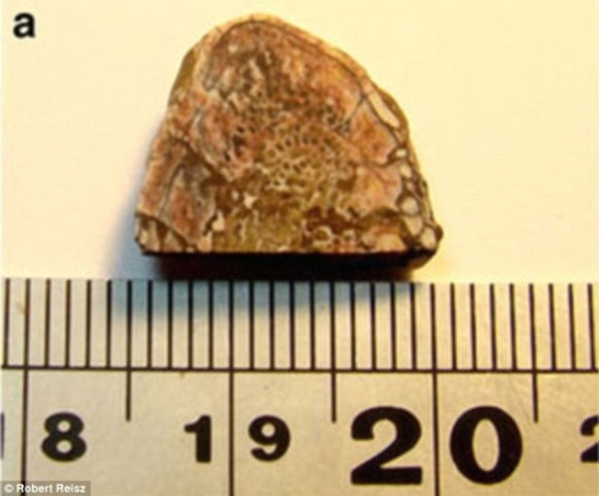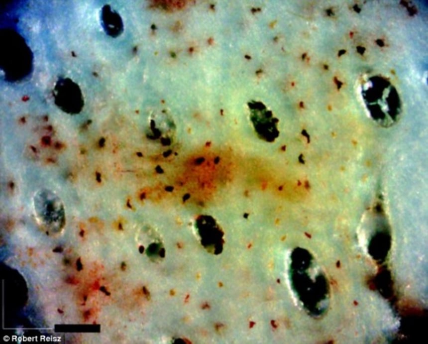 この画像を大きなサイズで見る1億9,500万年前の恐竜の肋骨が発見されたそうだ。これは非常に珍しい発見だ。何が珍しいかと言えば、肋骨のかつて血管や神経が通っていた脈管内部には完璧に保存されたタンパク質が残されていたのだ。いわば肉のついた骨なのである。