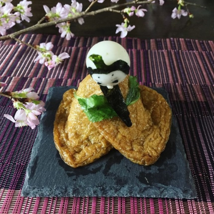 この画像を大きなサイズで見る材料はみてのとおり、おひな様グマはおこわ、おだいり様はおこわをいなりあげでくるんで、頭はウズラの卵。着物の一部はライスペーパーを着色して使用した。頭部は黒コショウや海苔、食紅などでメイキング。