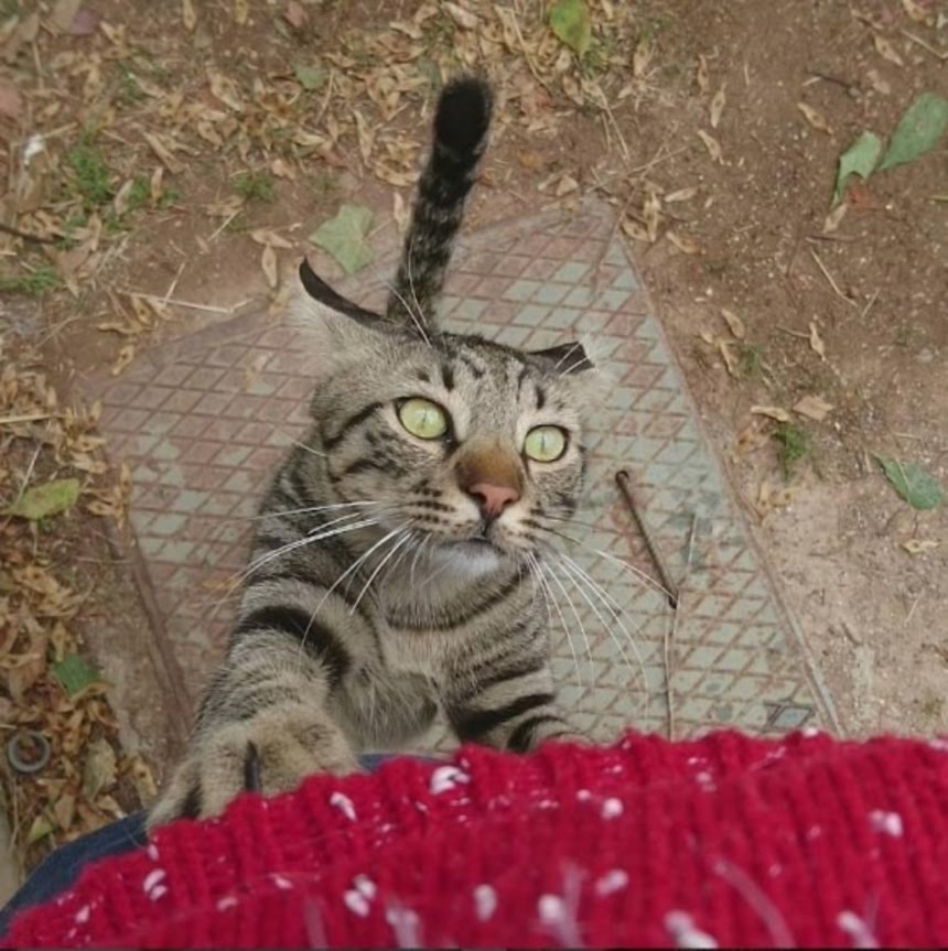 会うとニャーニャー甘えてエサをせびるからあげるんだけど