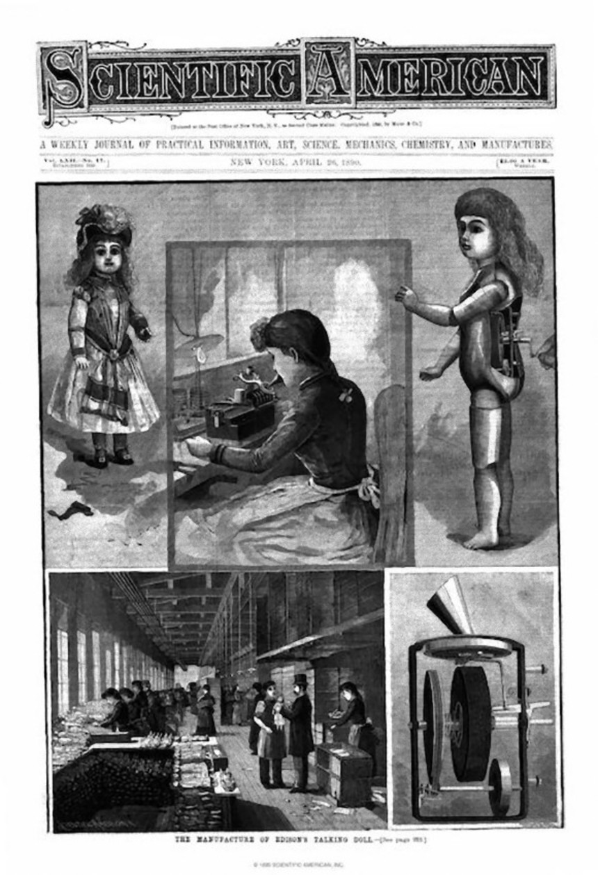 この画像を大きなサイズで見る蓄音機を発明したトーマス・エジソンが次に取り組んだのが、おしゃべりをする人形だ。1890年に特許出願された人形は、身長60センチ、木製の手足がついており、小型の蓄音機を内蔵していた。