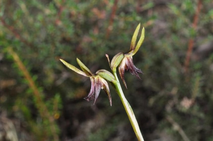 この画像を大きなサイズで見るランの仲間で、オーストラリア、ニューサウスウェールズ州サザンテーブルランズの数か所でしか知られていない。夏の終わりから秋にかけて1か月しか開花しないため、見つけることは難しいだろう。