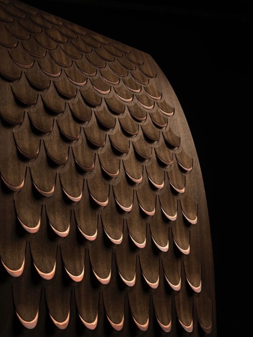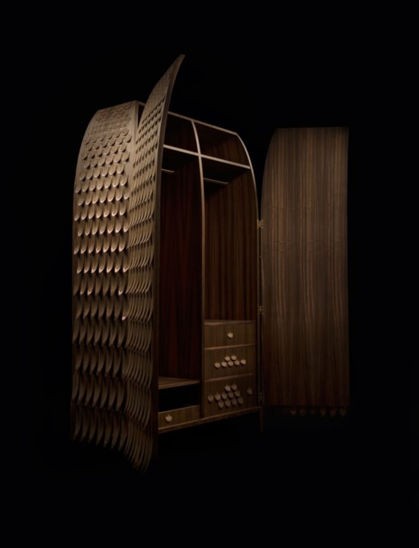 この画像を大きなサイズで見るまた、アボリジニの間で語り継がれている鱗だらけの生物を参考にしたワードローブなどもある。こちらは銅素材にクルミ材の化粧板を丁寧に張り付け、鱗風の装飾が施されたもの。