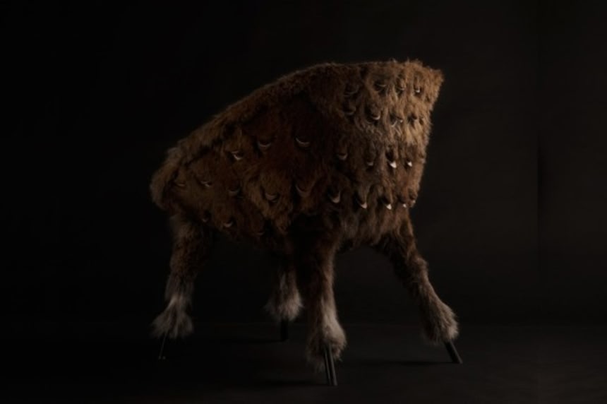 この画像を大きなサイズで見る長い毛に包まれたモフモフの椅子やウロコ状の板に覆われた奇妙な家具たち。その一点一点が何かの生き物を連想させる不思議な魅力と温もりを漂わせている。
