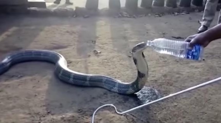 のどが渇いているのかもしれない。そこで1人の男性がキングコブラの尻尾をつかみ、攻撃されないよう防ぎつつ、もう1人の男性がコブラにペットボトルの水を差し出した。すると・・・