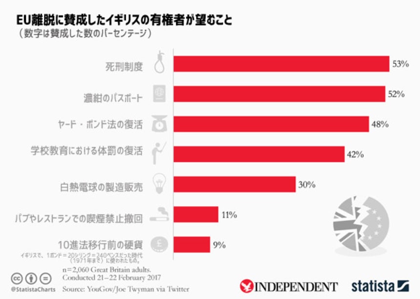 元記事が少し恣意的なように思える。死刑制度に賛成=悪という前提にたっているように見えるし、EU離脱反対派にリベラルが多いことを考えれば、アンケート結果がそうなるのは目に見えている。「EU離脱賛成派はアホ」と言いたいだけの記事ではなかろうか。