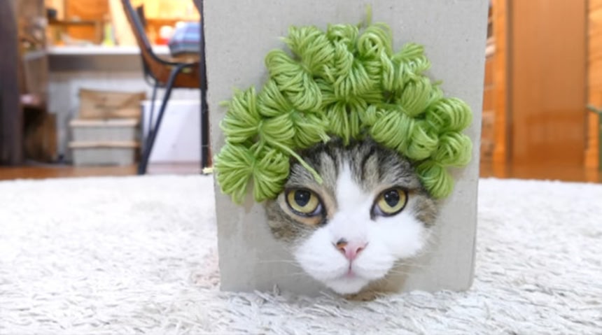 箱があったら入りたいまるさん。そこでまるさんが入った箱の表面に毛糸でつくったかつらを張り付けてみた。これが思いのほかクールビューティーなのだ。