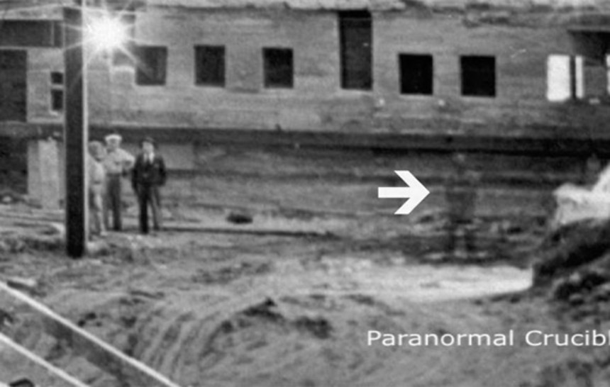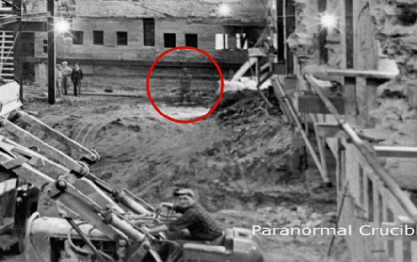 この画像を大きなサイズで見る動画内のモノクロ写真は1950年に行われていた大規模なホワイトハウスの再建工事の一コマで、写真家のアビー・ロウが撮影したものだ。そして問題の霊はその右側、画面の奥に立っている。