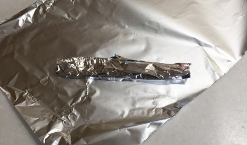 この画像を大きなサイズで見る・アルミホイルで直径2cm×12cmほどの筒を5本作り、さらにその上から再度アルミホイルで包み強化する。