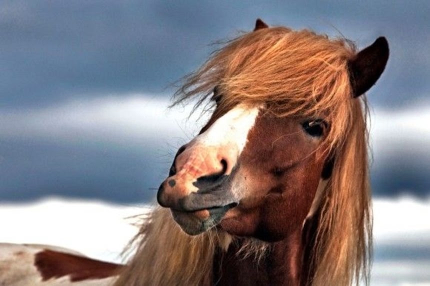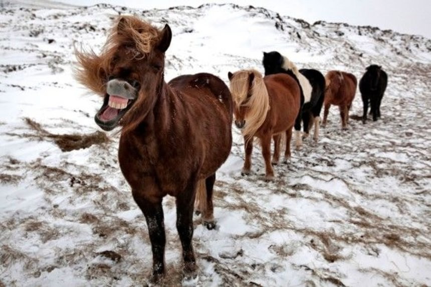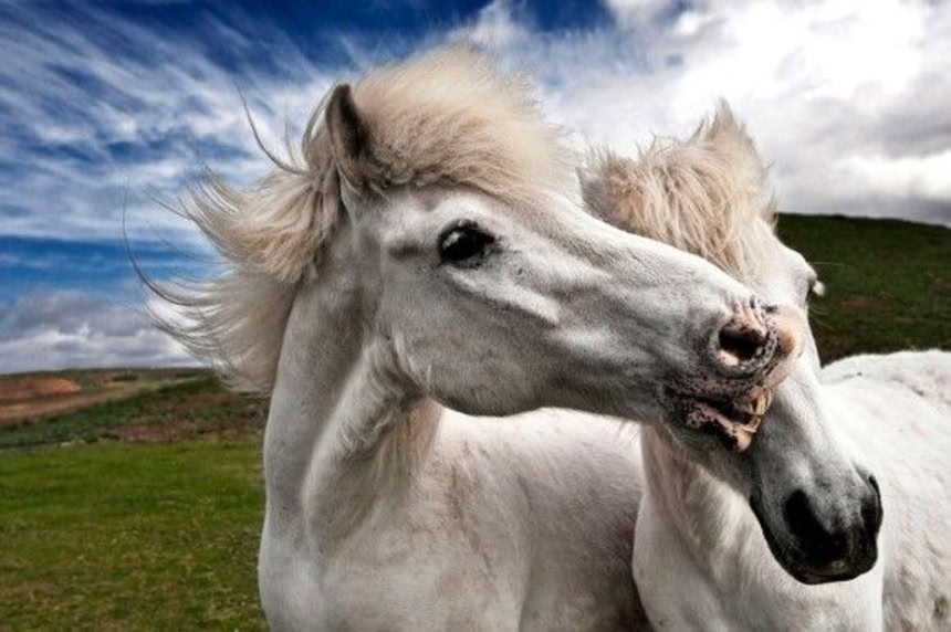 この画像を大きなサイズで見る一頭はカメラを見て笑っている。アイスランドでは野生の馬が生息しており、群れを作って暮らしている。馬同士コミュニケーションをとり、よく笑い、よく遊び、お互いに抱き合ったり、時に喧嘩をしながらも毎日を生きている。