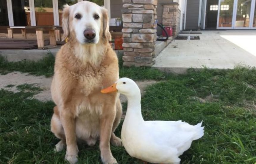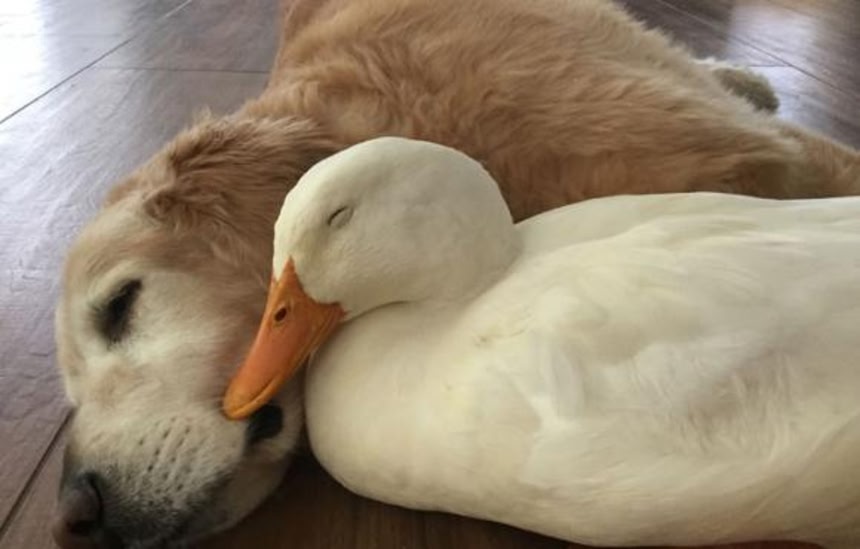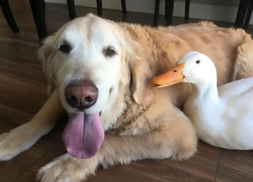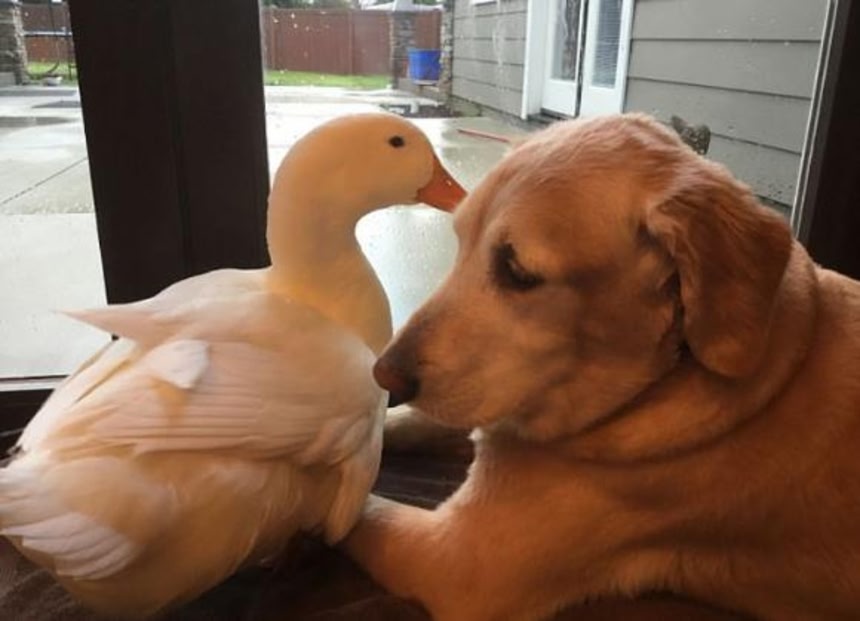 今では強烈な絆で結ばれているゴールデン・レトリバーのバークレーと4才の北京ダック、ルディだが、出会ったばかりのころは険悪なムードだった。