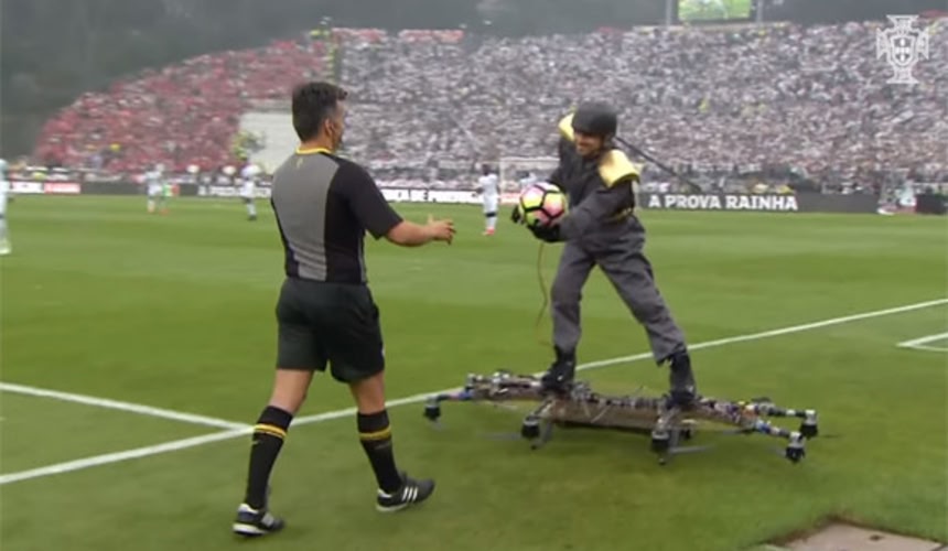この画像を大きなサイズで見る今月5月28日に行われたポルトガル杯の決勝戦で、サッカーファンは近未来的なホバーボードに乗る男性が上空から舞い降りて審判にボールを手渡すというSF的な光景を目の当たりにした。