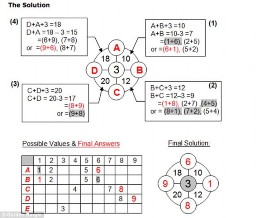 この画像を大きなサイズで見る回答例:各象限の数字は、それぞれの外周の2つの円と中央の円の数字の合計に等しい。外周の円の数字は1~9までで、それぞれ1度しか使用できない。中央の円の数字から次のように4つの円の数字を求めることができる。