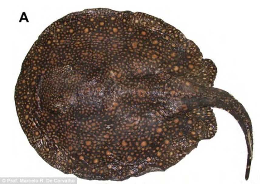 この画像を大きなサイズで見るブラジル、トカンチンス川に生息する水玉模様が特徴の淡水エイ。発見された標本は、全長1,110ミリだが、大きいものなら20キロに達するかもしれない。