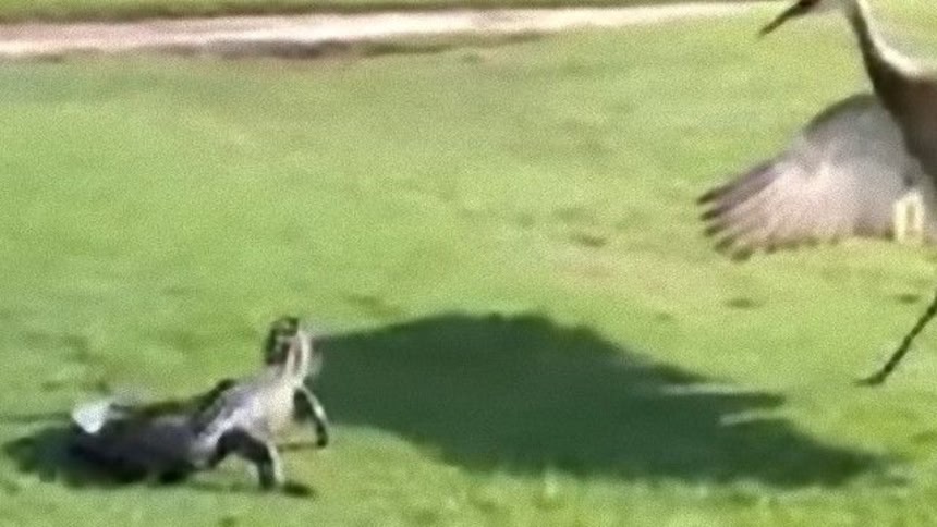 カナダヅル3羽が小型のワニに徐々に近づいていく。そしてリーダー格の1羽が距離を詰めると、その気迫を感じ取ったワニは急いで逃げだすではないか。ツルも「逃がさん!」とばかりにワニの後ろを追っている。
