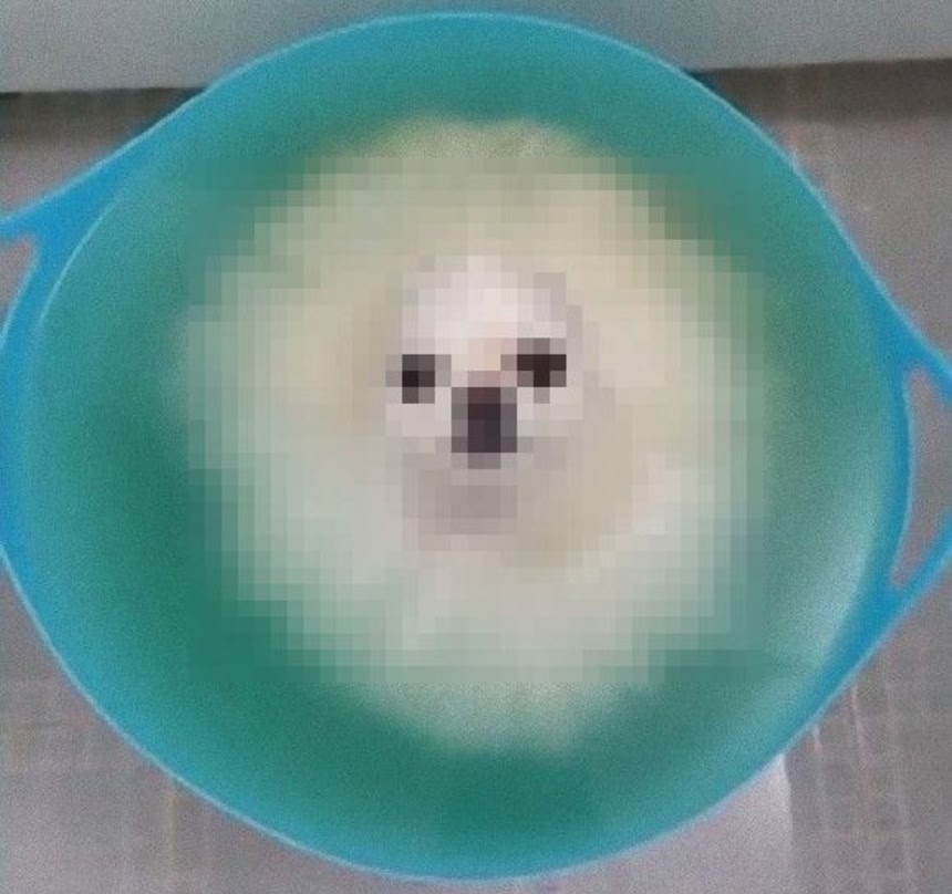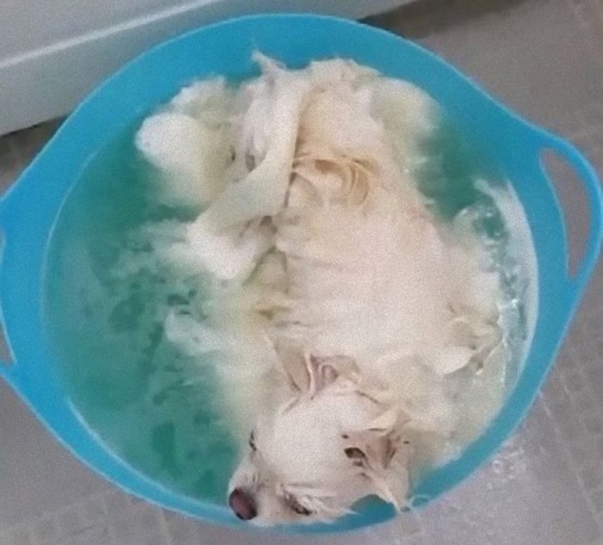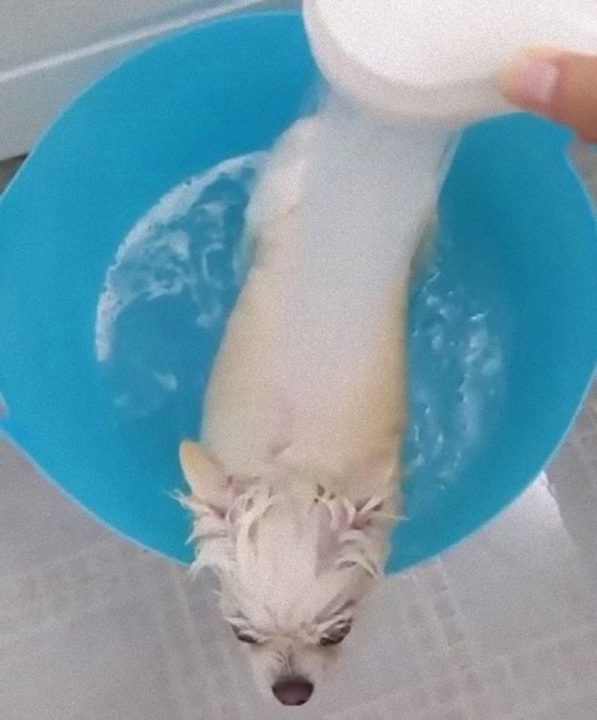 韓国・京畿道(キョンギド)のとある民家で撮影された、ポメラニアンのバニーさんのバスタイム。お湯をはった青いバケツの中に、バニーさんが顔だけ出してすっぽりと浸かるスタイルだ。
