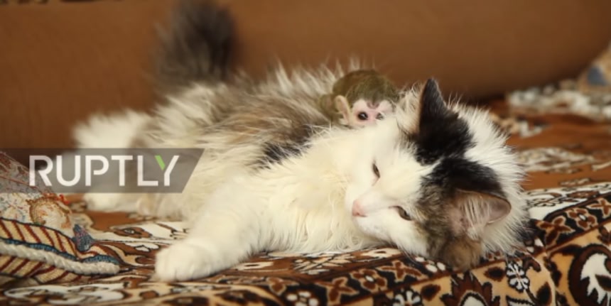 この画像を大きなサイズで見るロシアのチュメニ州の動物園が公開した、育児放棄されたリスザルの赤ちゃんと母親役を引き受けた猫のほほえましい姿の映像が話題になっている。