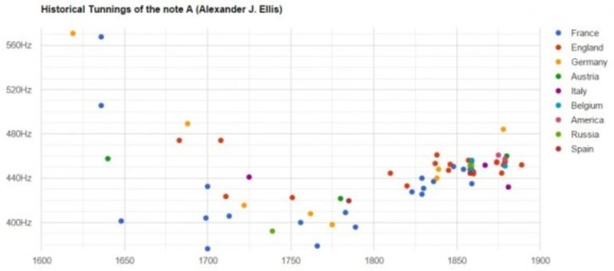 彼の目的が演奏上の理由であったことはすでに述べた。実のところ、基準ができるまで、Aの音は400Hzから460Hzまで変動している。