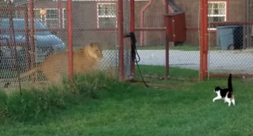 アメリカ、テキサス州の動物研究教育センターで飼育されているライオンの前で解き放たれたイエネコのバギィ。