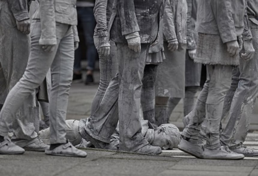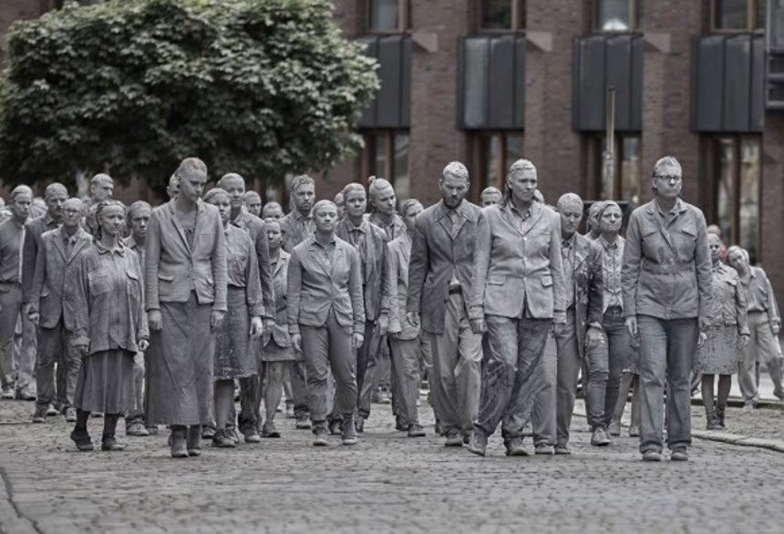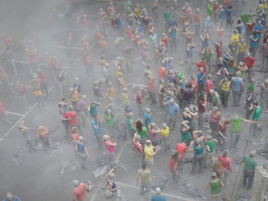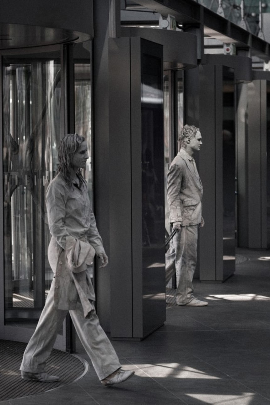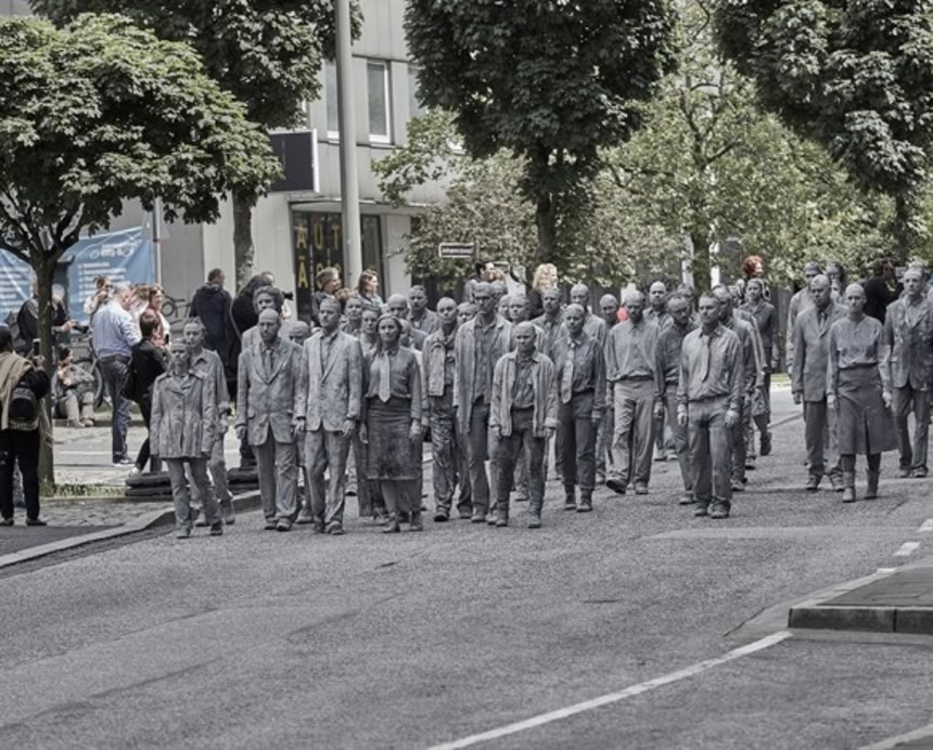 この画像を大きなサイズで見る7月5日、ドイツ・ハンブルクの街中に、全身に粘土を塗りたくった灰色の人々が突然現れた。その数、なんと1000人。亡霊のような、ゾンビのような集団がぞろぞろ・・・ちょっとコンビニ行ってくるわ的な気軽さで出掛けてこれに出くわしたら100%ビビる。