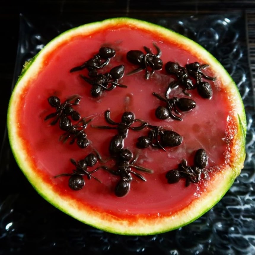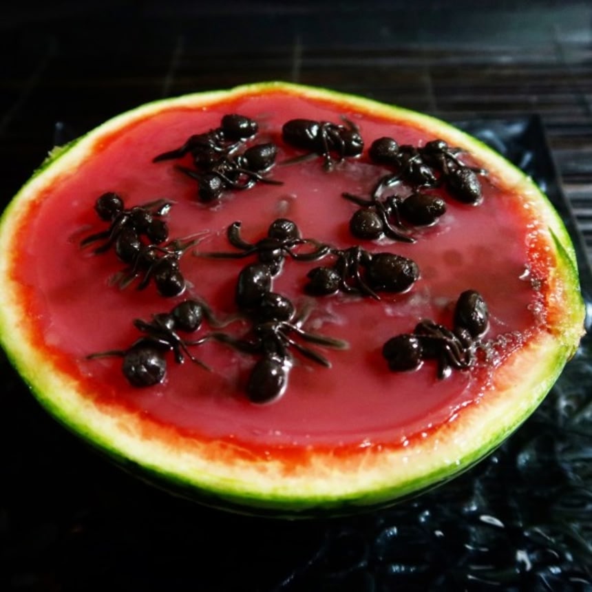 この画像を大きなサイズで見るアリはクマ姉さんのお家芸、「ねりきゃんランド」を使用してメイキング。スイカは中身をぶっこ抜いて、果肉の一部をザルで濾して水を足して、寒天と砂糖を入れてゼリー状にしたものを皮に詰め込んだわけさ。