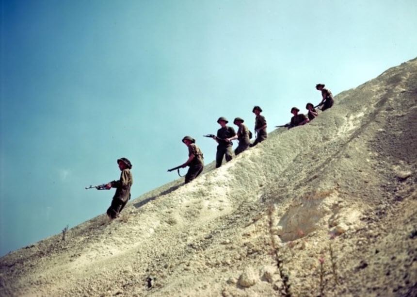 斜面に沿って展開するアメリカ軍。おそらくは演習中。