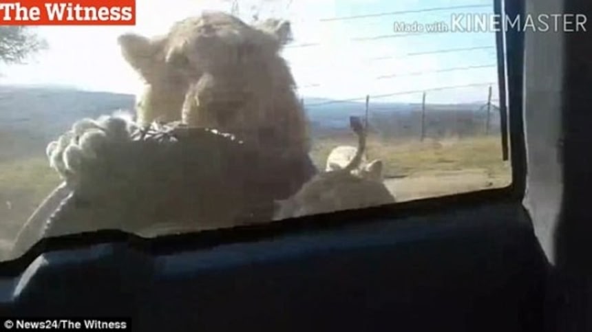 不運にもその車に乗り合わせ、窓一枚隔てた向こうでスペアタイヤにガシガシ噛みつくライオンを見守ることになった人々は、制御不能な野生動物の恐ろしさを味わったという。