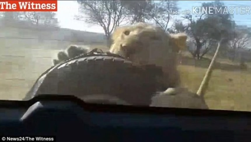 この画像を大きなサイズで見る南アフリカのサファリパークにて、観光客の車の後ろに飛びついてかぶりつくライオンが出没、その動画が人々を震撼とさせている。