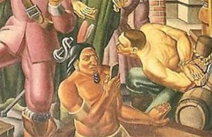 この画像を大きなサイズで見る17世紀のアメリカ植民地時代を描いた1930年代の絵画に、スマートフォンを見つめるアメリカ先住民の姿が描かれており、タイムトラベルの証拠ではないかと物議を醸している。