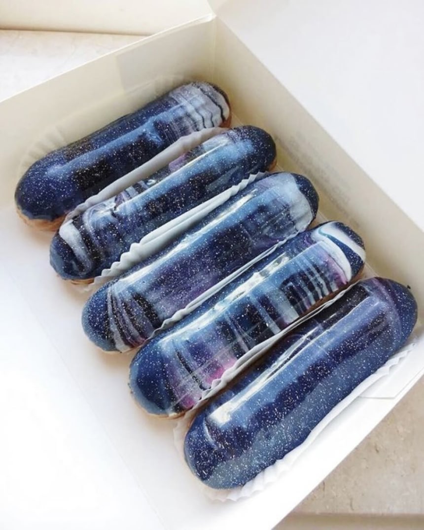 この画像を大きなサイズで見る青や紫、ピンクなどの色が一体となって星々がきらめく銀河を形成しており、まさか宇宙成分がゼロだなんて信じがたい。エクレアなのにギャラクシー感溢れすぎてて食べるのがもったいないってこのことだなおい。お菓子の無限の可能性を示しているかのようなエクレア、おそろしい子(白目)。