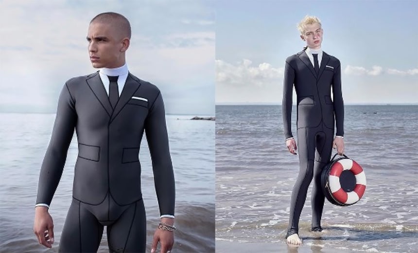 アメリカ・ニューヨークのファッションブランド、トム・ブラウンの2017年初夏コレクションのひとつとして発表されたビジネススーツ型のウエットスーツ「トロンプ・ルイユ(騙し絵)」は、ウエットスーツのクリエイター、シェーン・ジョーンズさんとタッグを組んで制作したものだそうだ。