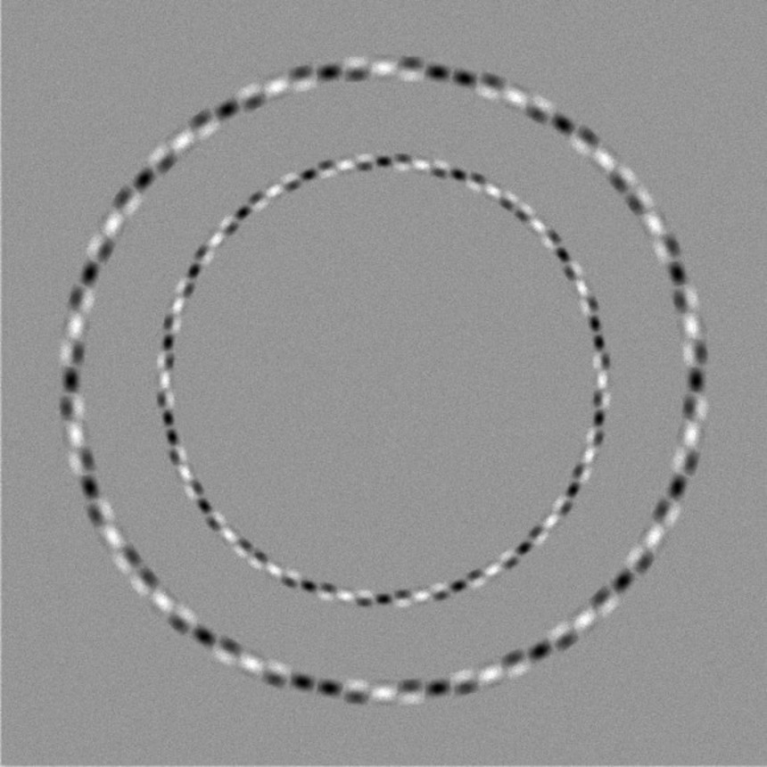 この画像を大きなサイズで見る 問題の画像はこちらだ。青っぽい色を背景にしたうねうねの渦巻きにも見える。だが実はこれ、中心が同じ場所にある完全な円(真円)、いわゆる5つの同心円なのだという。