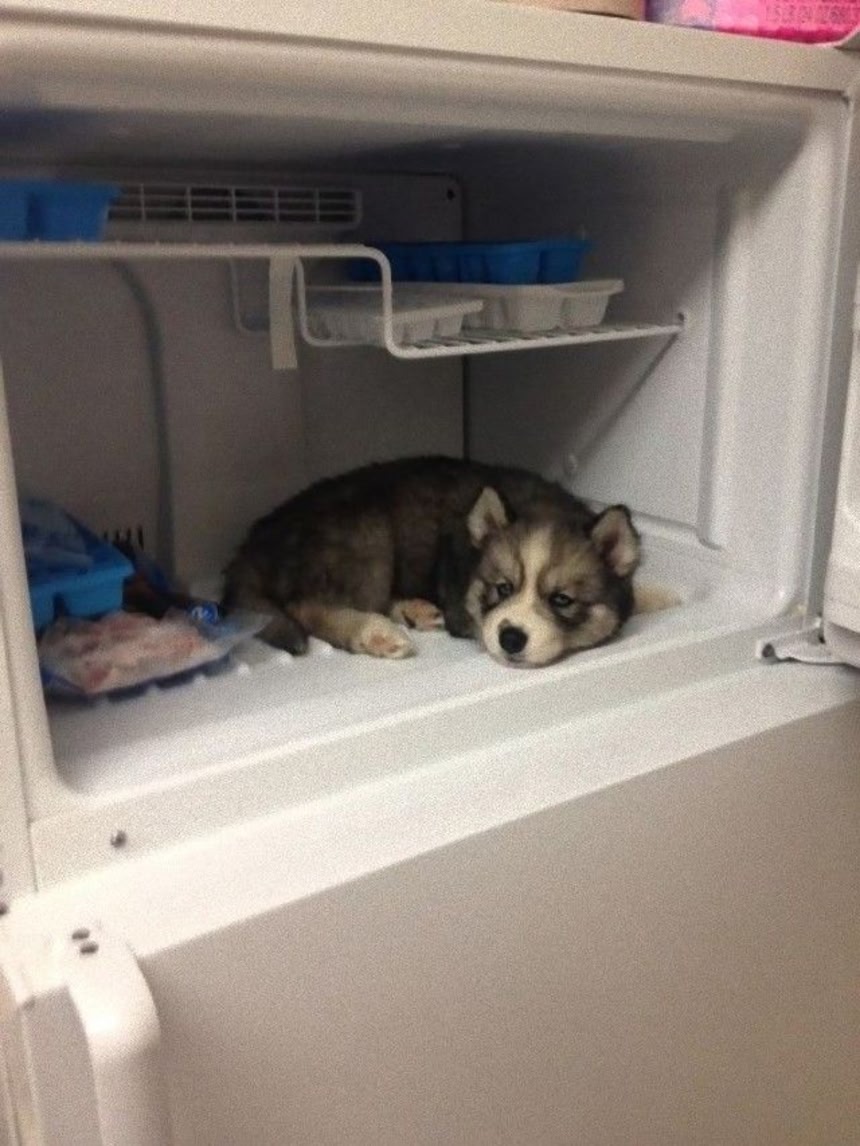 犬が自分で入れる高さじゃない冷蔵庫や冷凍庫に収まってる画像は違うだろ。暑さでぐでって無抵抗なのをいいことに飼い主に突っ込まれてるだけじゃんか。猫なら扉開いてりゃ勝手に入るけど犬には無理だよ。