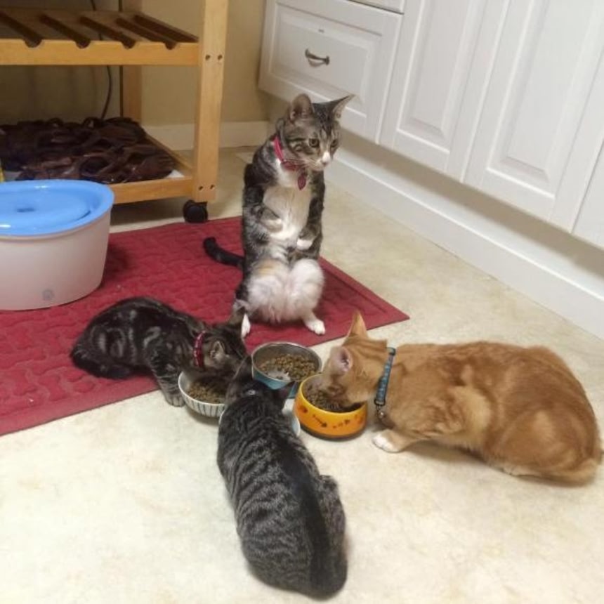 「カンガは母性が止まらないようで、あっという間に子猫たちの保護者のようにふるまうようになりました。この写真はカンガが子猫たちが十分にご飯を食べているか見守っているところです。」
