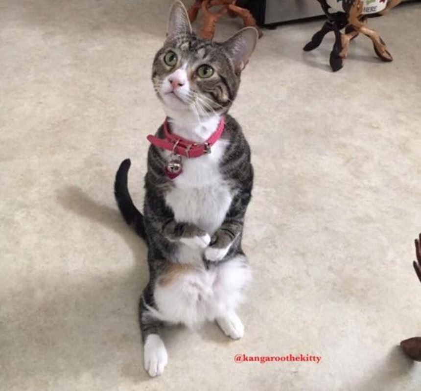 この症状を持つ猫は、4本足で立とうとすると前脚にあまりに大きな負担がかかるため、後ろ脚で立つ姿勢を取ることが多い。カンガもそうだった。