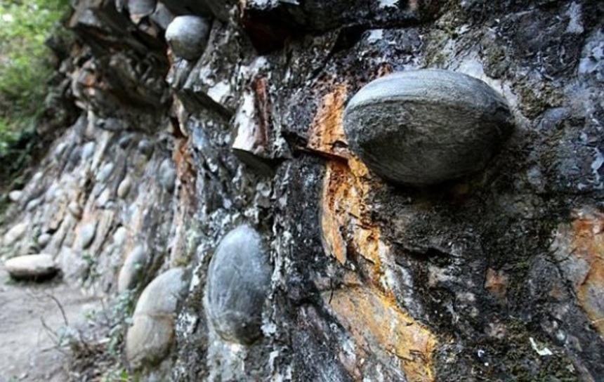 この現象は長年地質学者たちの頭を悩ませてきた。高さ6メートル、幅20メートルのかなり侵食されたこの崖の表面はでこぼこしていて、そこから様々な大きさの丸い”石の卵”が約100個、あちこちに顔をのぞかせている。