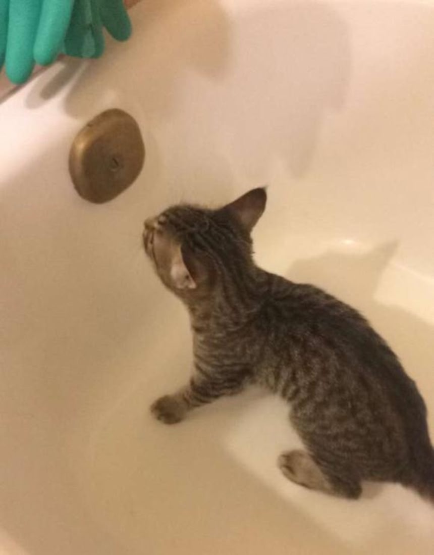 クロスビーはスクウィッシュピーチーズさんを導くようにお風呂の方へと誘導した。そこにはなんと、小さな子猫ちゃんがいたのである!