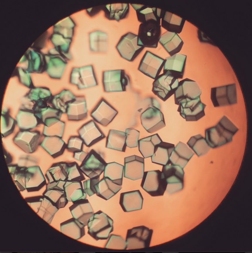 この画像を大きなサイズで見る2枚のガラス板で圧縮したリボチーム結晶の膜に圧力をかけると、圧電気というエネルギーが生じる。すなわち電荷が機械的なストレスへの反応として蓄積されるのだという。