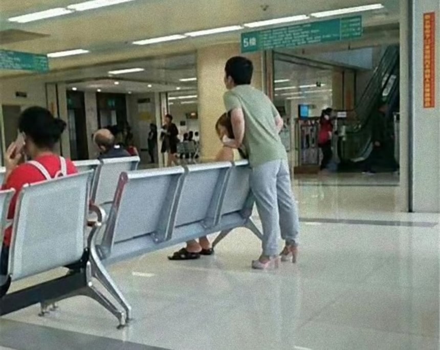 中国・重慶市にある重慶病院にて、シエさんと名乗る女性が撮影したとされるこちらの写真。診察を待っているらしきカップルが写っているのだが、足元に注目してもらいたい。