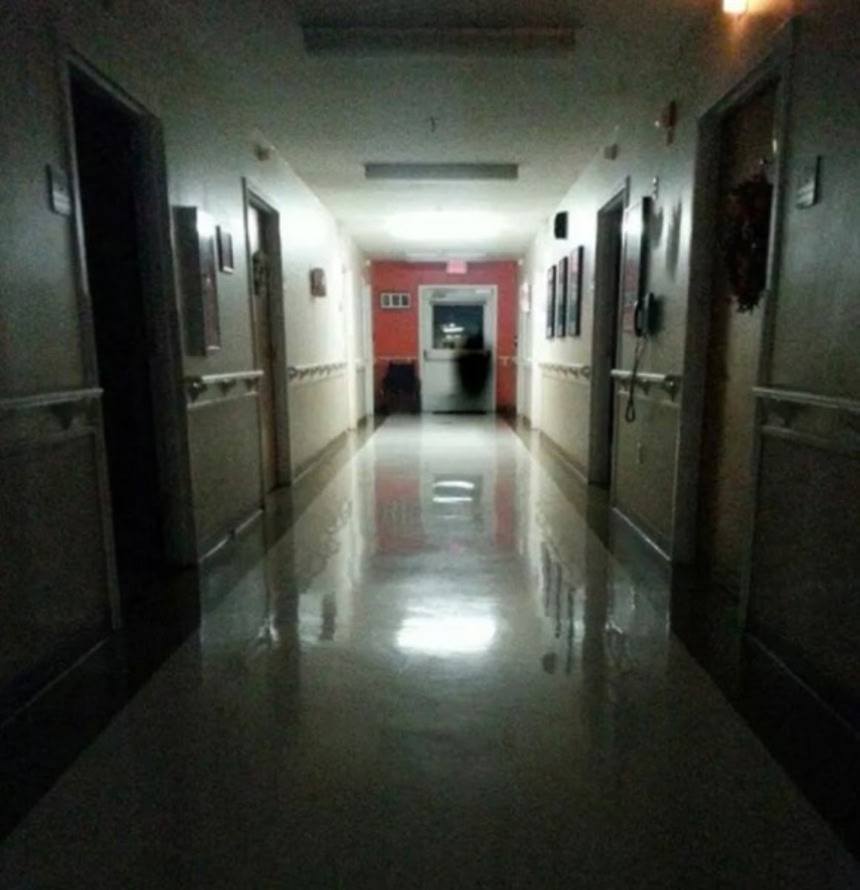 閉鎖されたサナトリウムで撮影されたこの写真には、病室のドアの前に患者らしきおぼろげな姿が立っている。これは未加工の写真である。