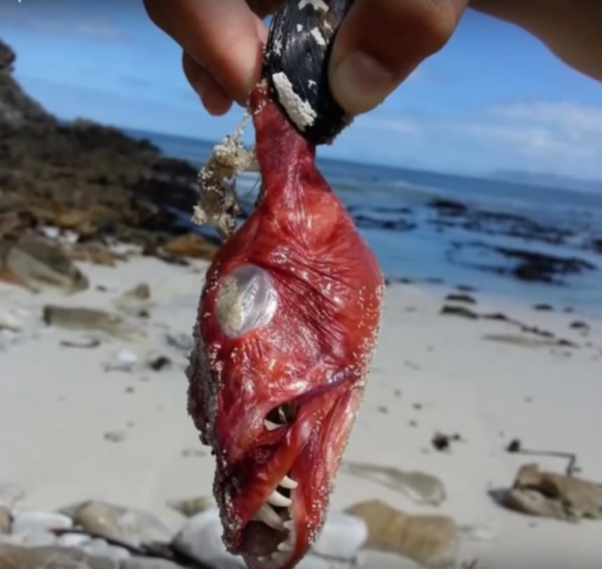 この画像を大きなサイズで見るこのさな生き物は、南アフリカのケープタウンの砂浜で観光客によって発見された。体のほとんどが口のようで、すごい牙が生えている。