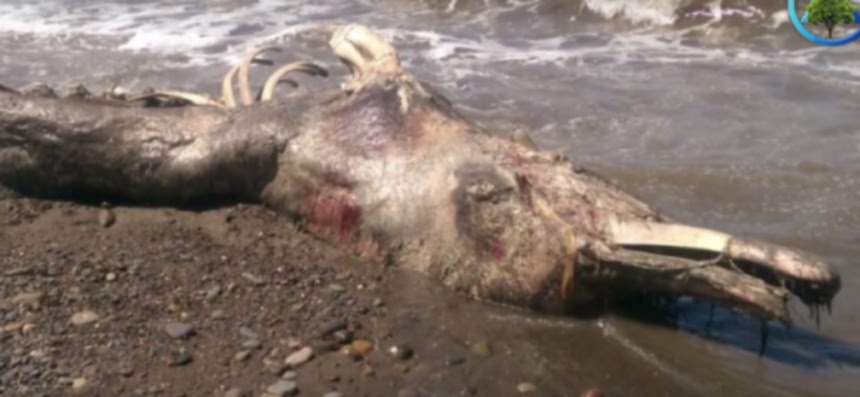この画像を大きなサイズで見る2015年、ロシア、サハリンの海岸に、正体不明の生き物の腐敗した遺骸が漂着した。なんらかの敵のせいで相当ボロボロになっていた。