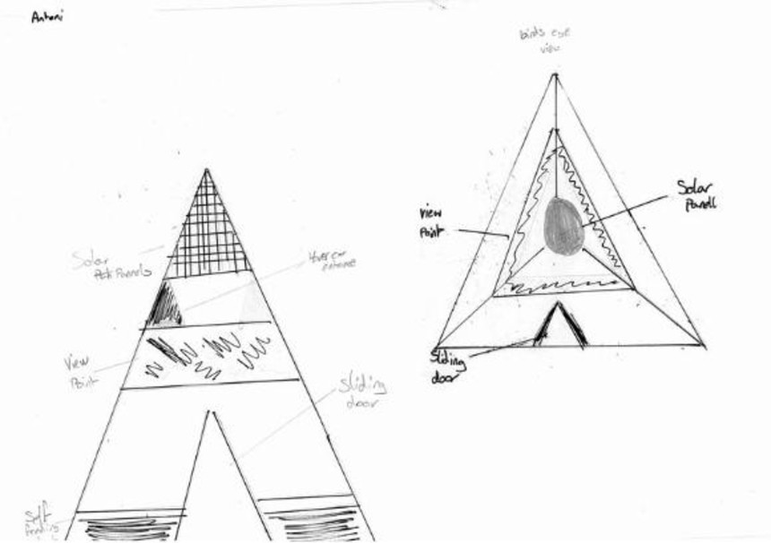 この画像を大きなサイズで見る10才のアントーニの作品。太陽光発電のピラミッド状の家のてっぺんには全景を見渡すことができる場所が設置されており、その下にはホバーカー専用玄関つきだ。四方に窓がある。非常時、災害時にも耐えうるデザインだ。