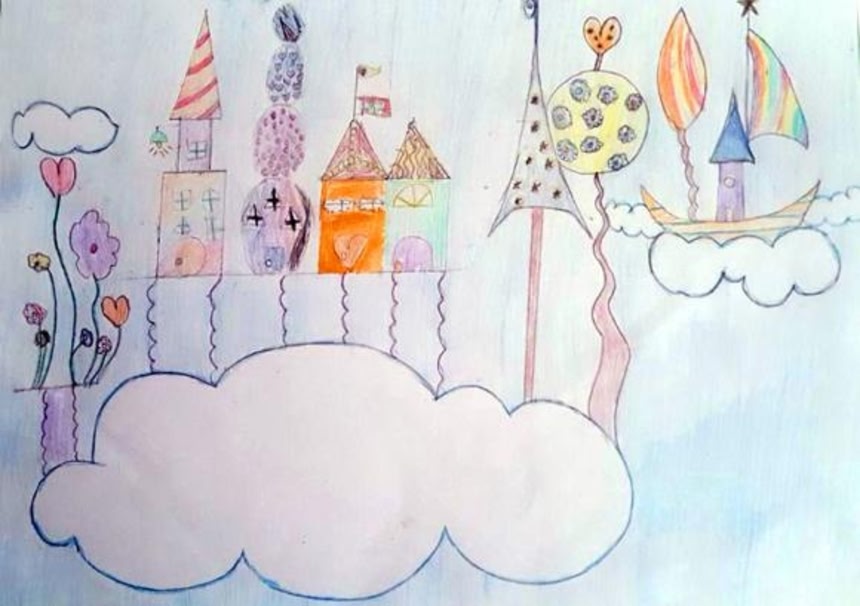この画像を大きなサイズで見るイギリス、クローリー出身のアミーン(10歳)の作品。雲の上に浮かぶ家々。空の上にある家ならば海面の上昇など心配なしだ。