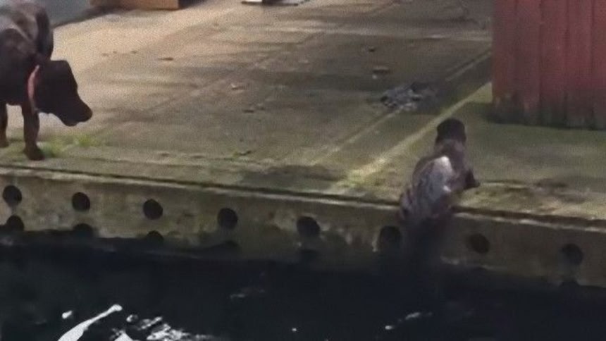 港に戻るカワウソの前に海から上がってきたレトリバー