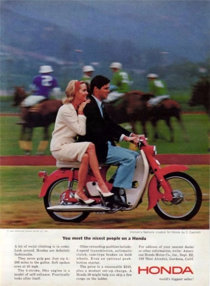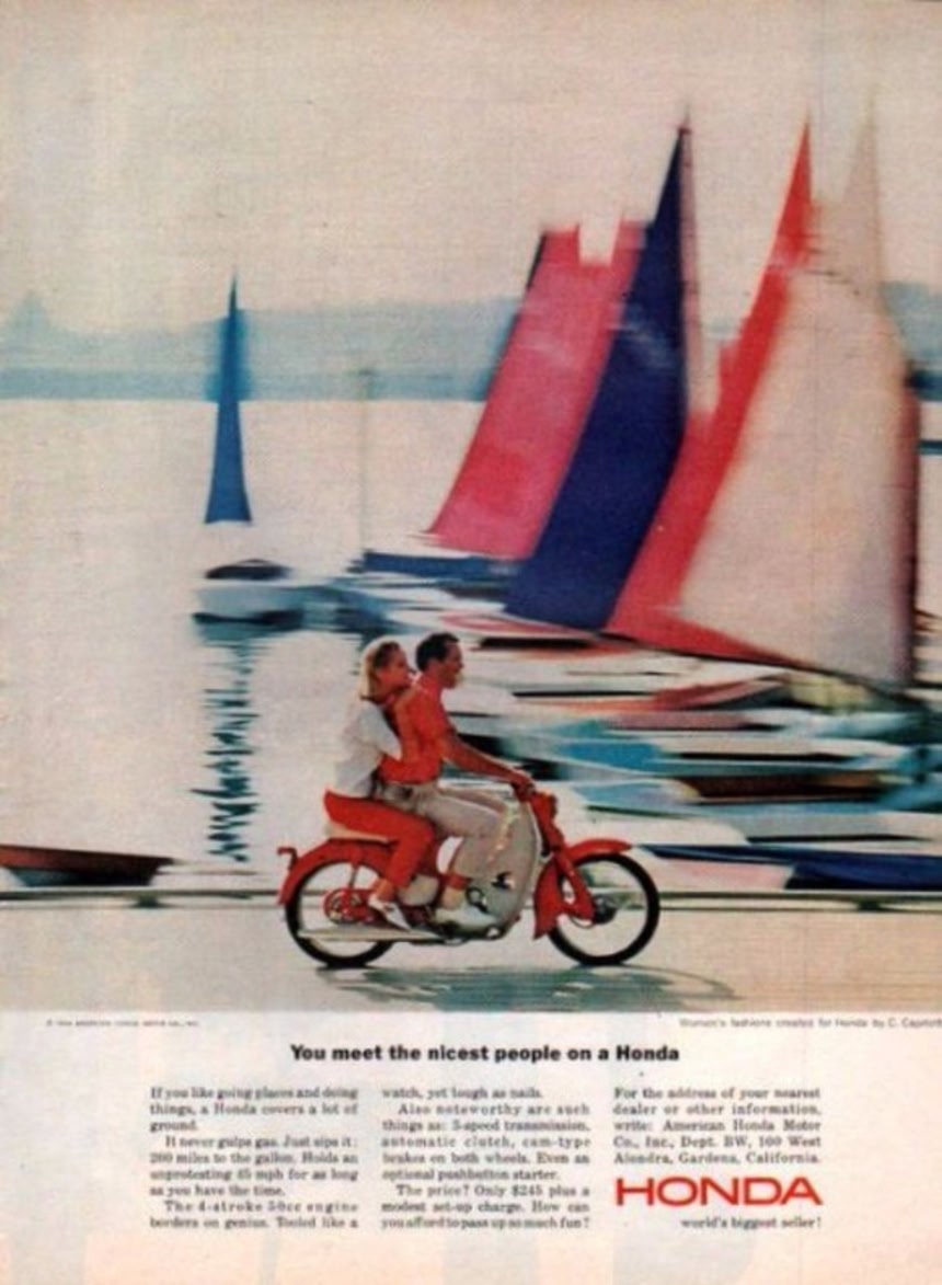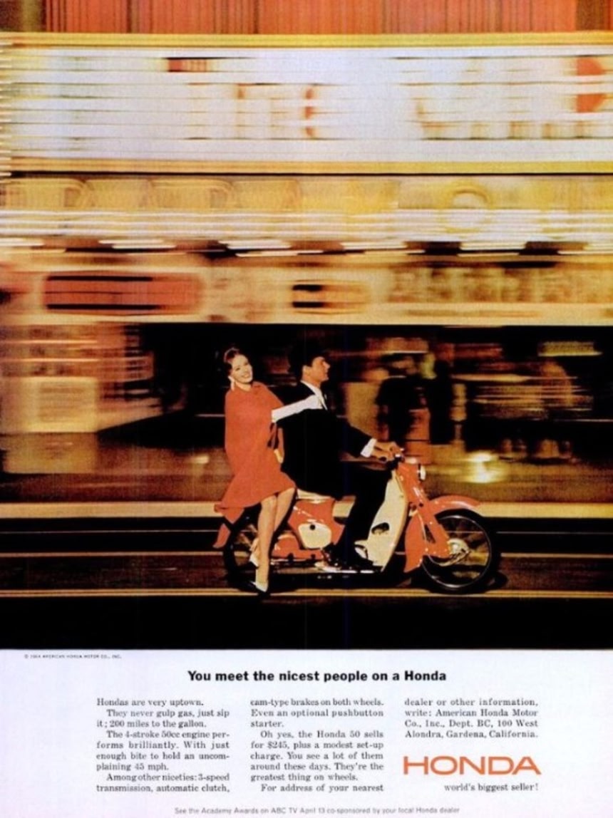 1961年には多額の広告費を投じて、「ナイセスト・ピープル・キャンペーン」を展開。コンパクトでパワフルなスーパーカブは、1965年にはアメリカのオートバイの市場をほぼ独占したという。